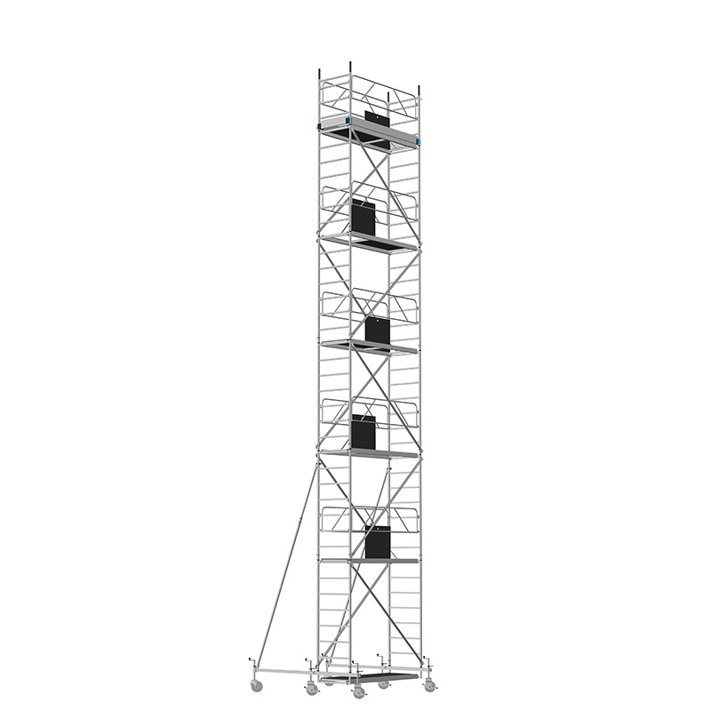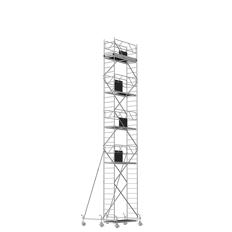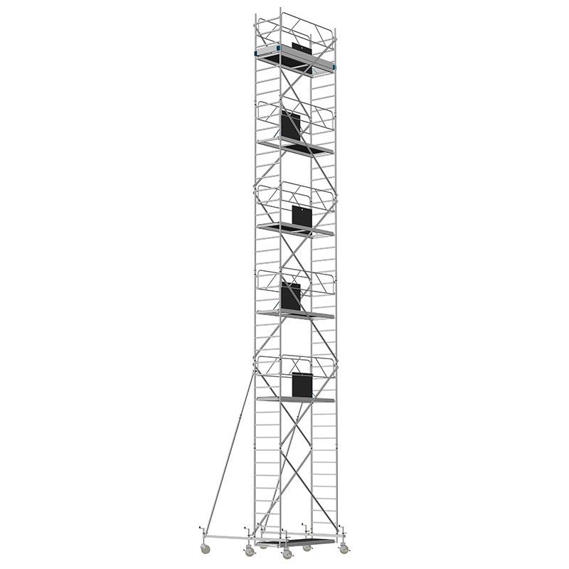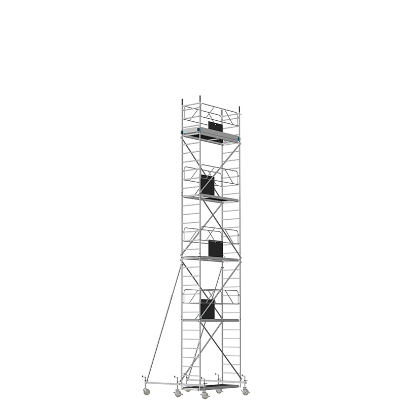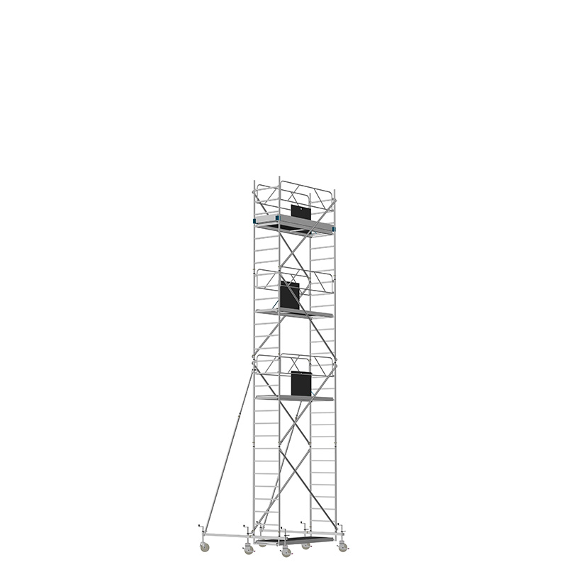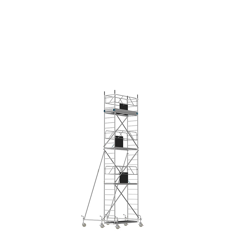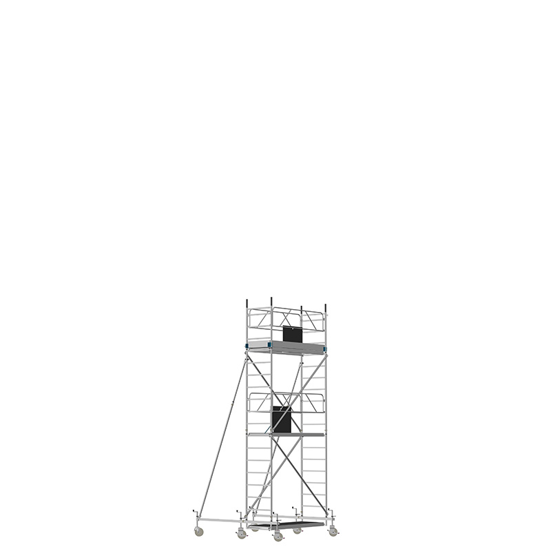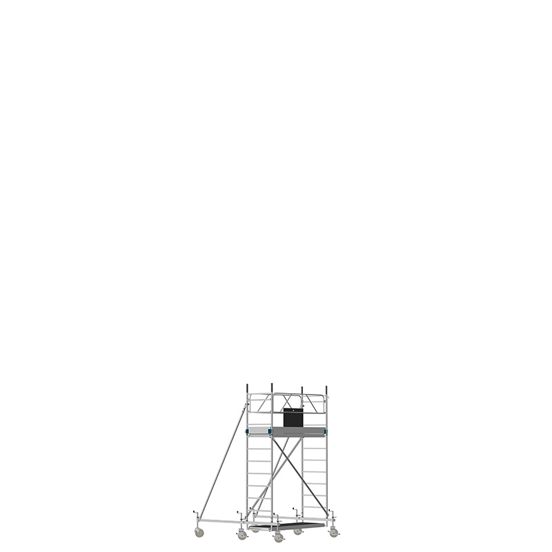 Unsere Fahrgerüste mit Rechtecksprossen entsprechen einer äußerst robusten Handwerkerausführung. Der Aufbau ist kinderleicht, da es sich um einfache Steckverbindungen handelt. Die Diagonalen werden an Bolzen mit Fallzunge, welche am Ständerrohr angeschweißt sind, eingehängt.