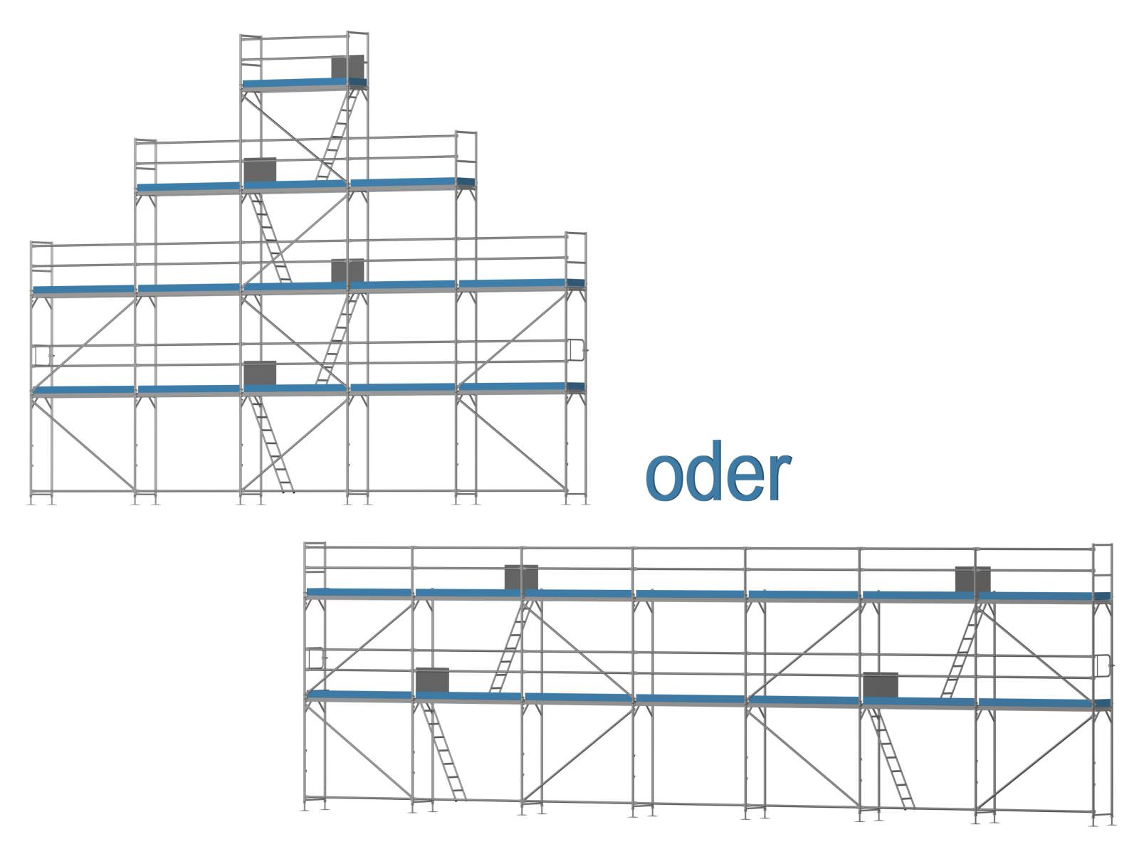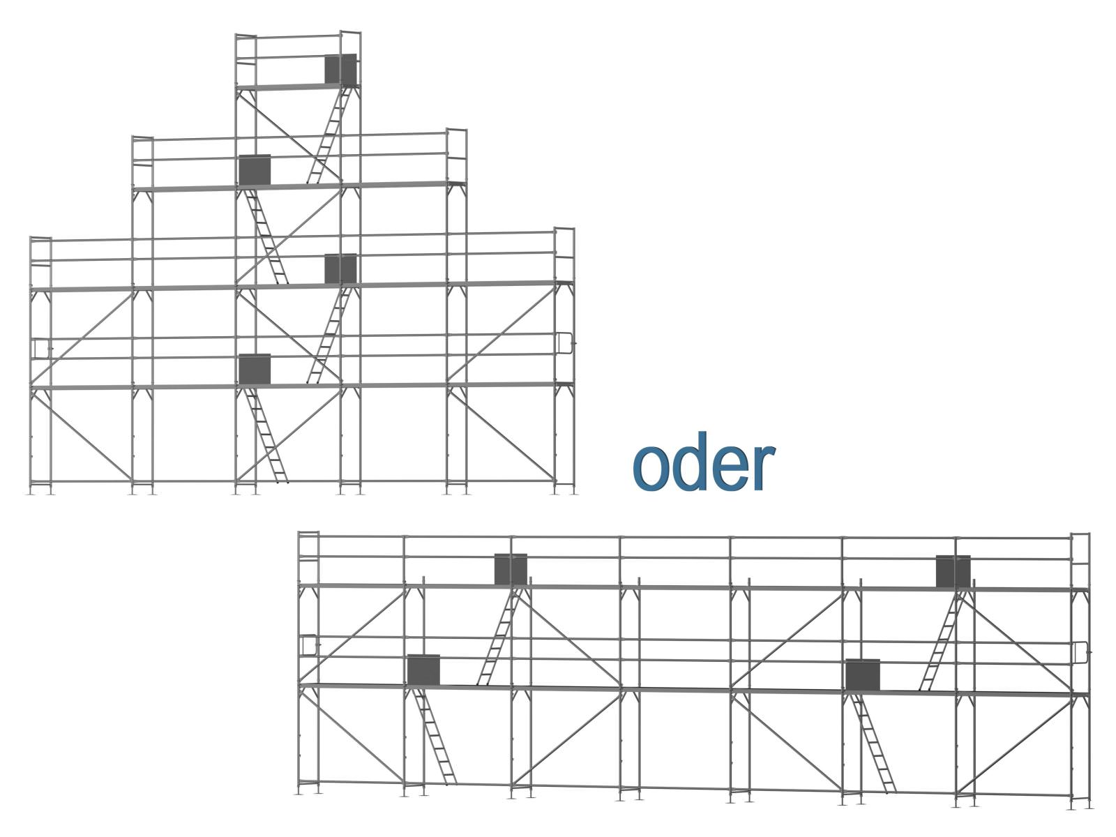 | Art-Nr. | Bezeichnung | Material | inkl. Aufstieg / Befestigung | inkl. Bordbretter | inkl. Teile für Umbau auf Traufseitengerüst | Listen-Preis € | Online-Preis € | |