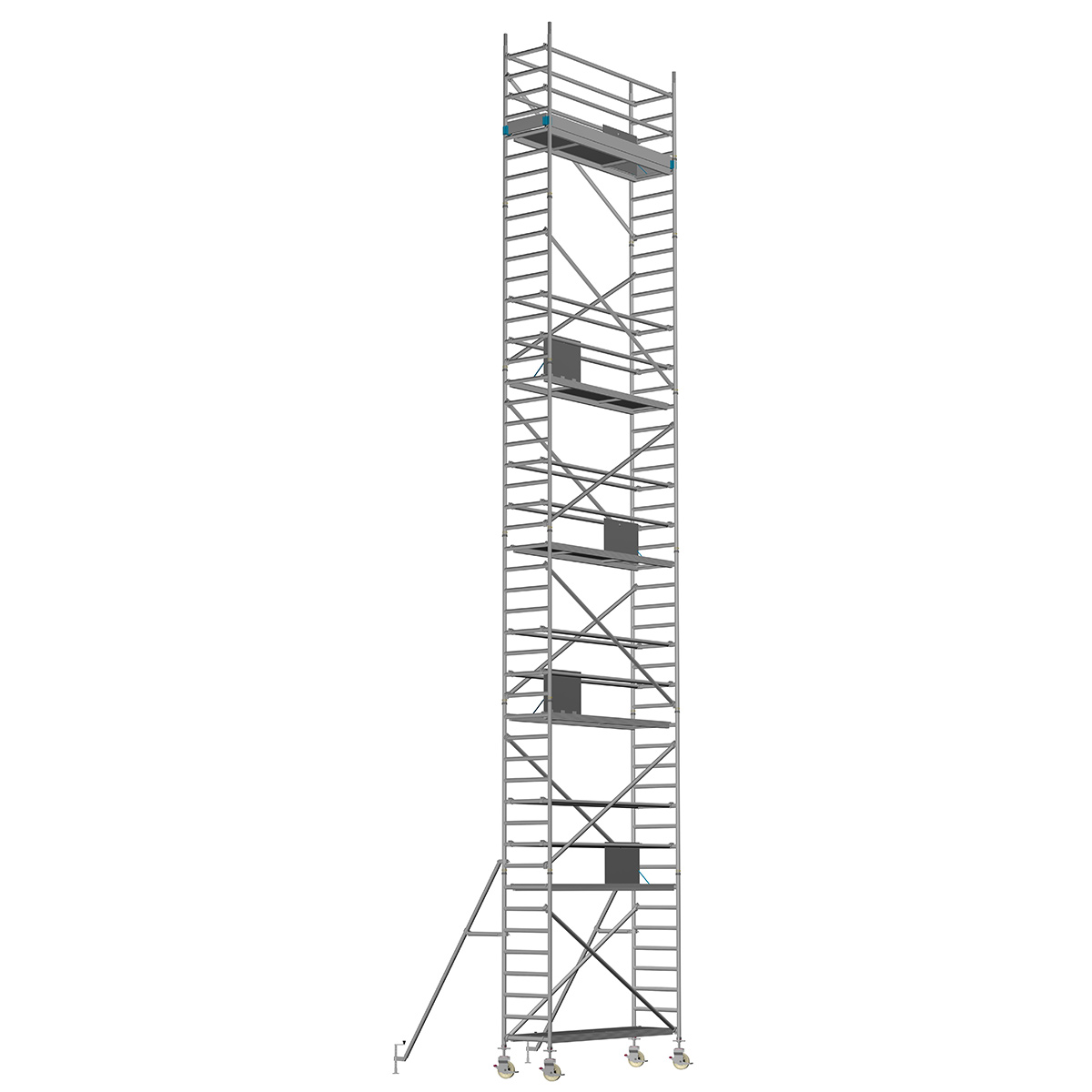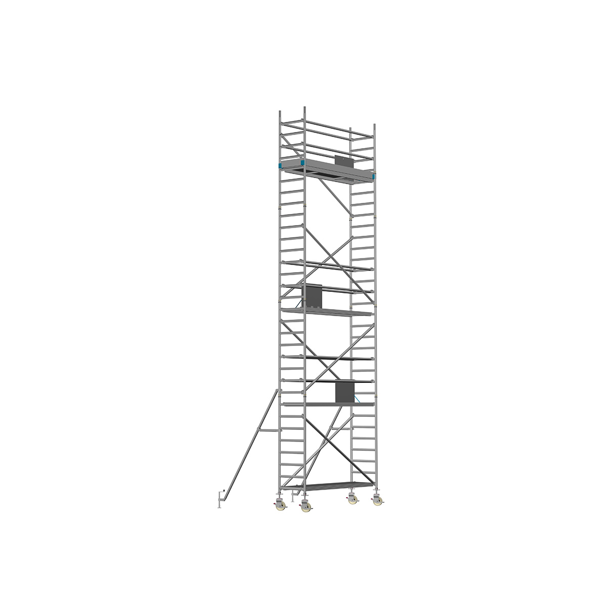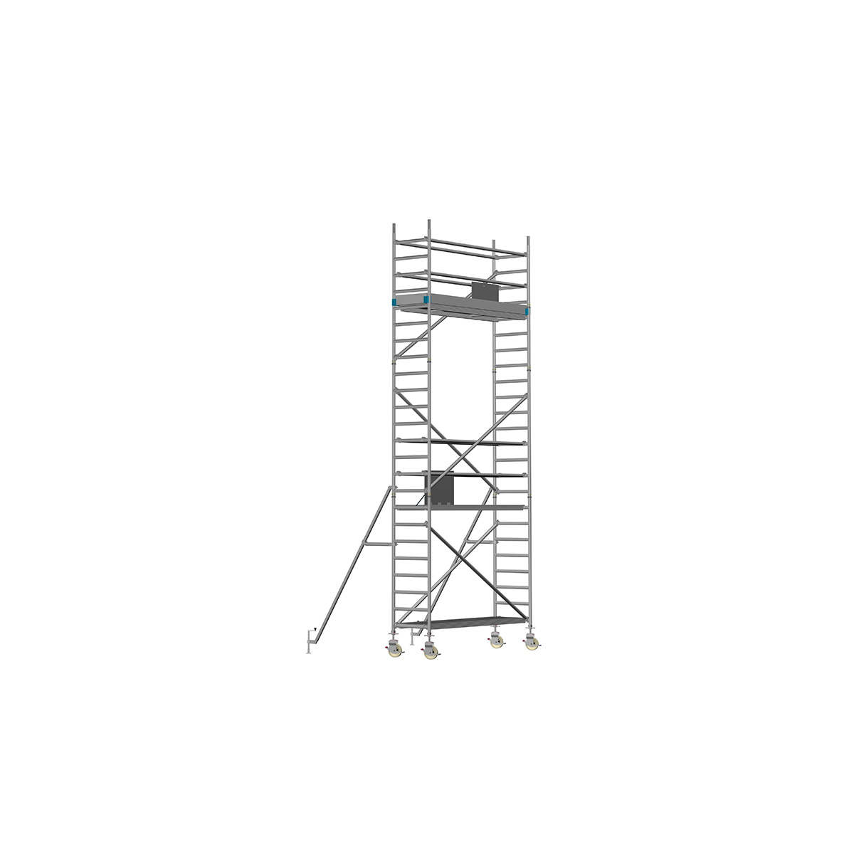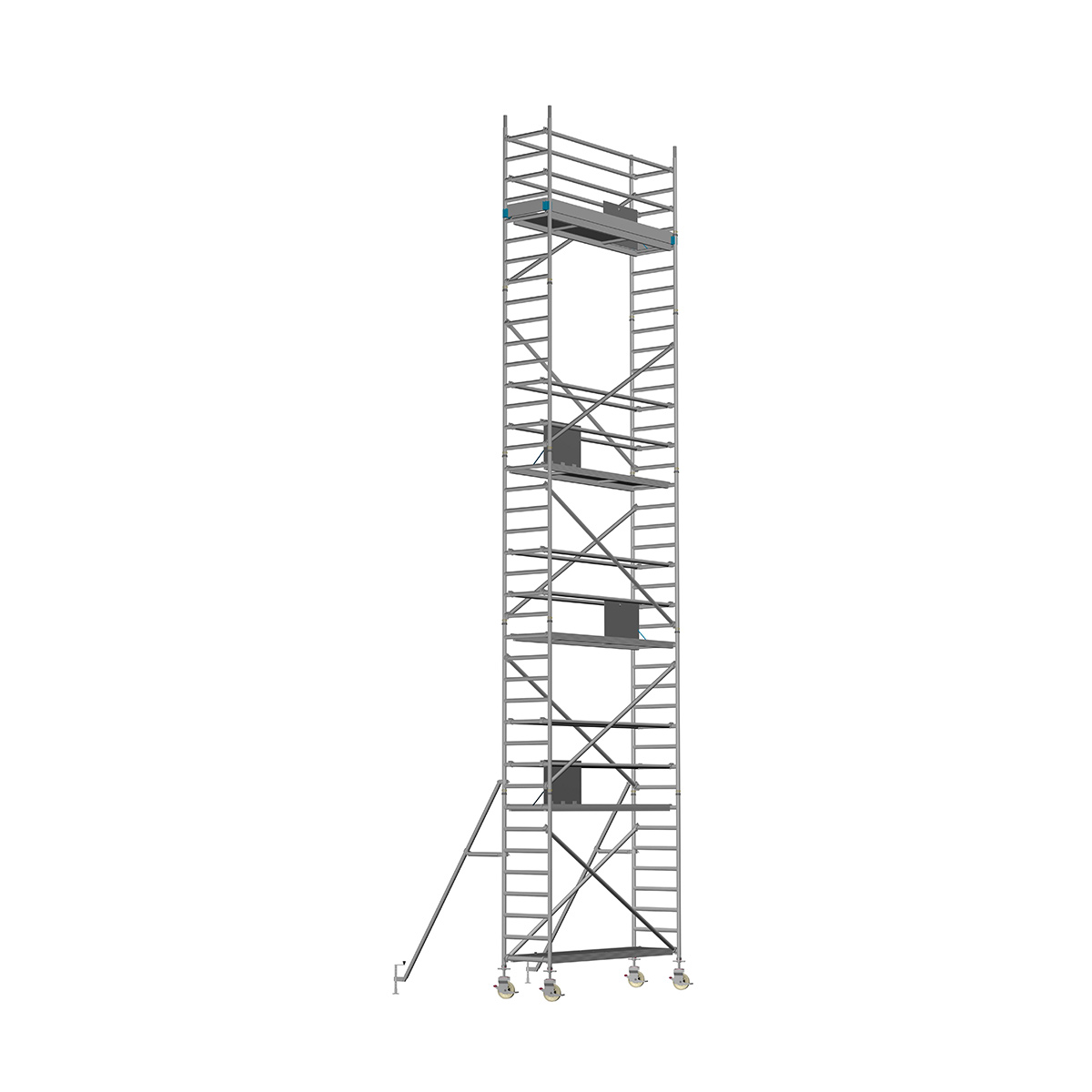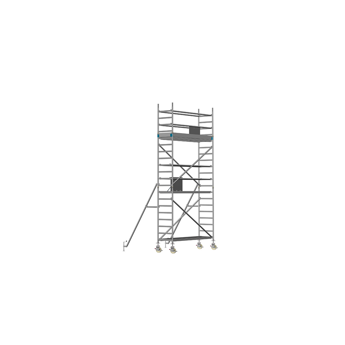 Unsere Fahrgerüste mit Rundsprossen entsprechen einer extra stabilen Industrieausführung. Der Aufbau ist kinderleicht, da es sich um einfache Steckverbindungen handelt. An den Diagonalen und Horizontalen (Geländer) sind Aluminiumklauen angeschweißt, welche formschlüssig über der Rundsprosse liegen. Eine spezielle Sicherung verhindert versehentliches Aushängen.