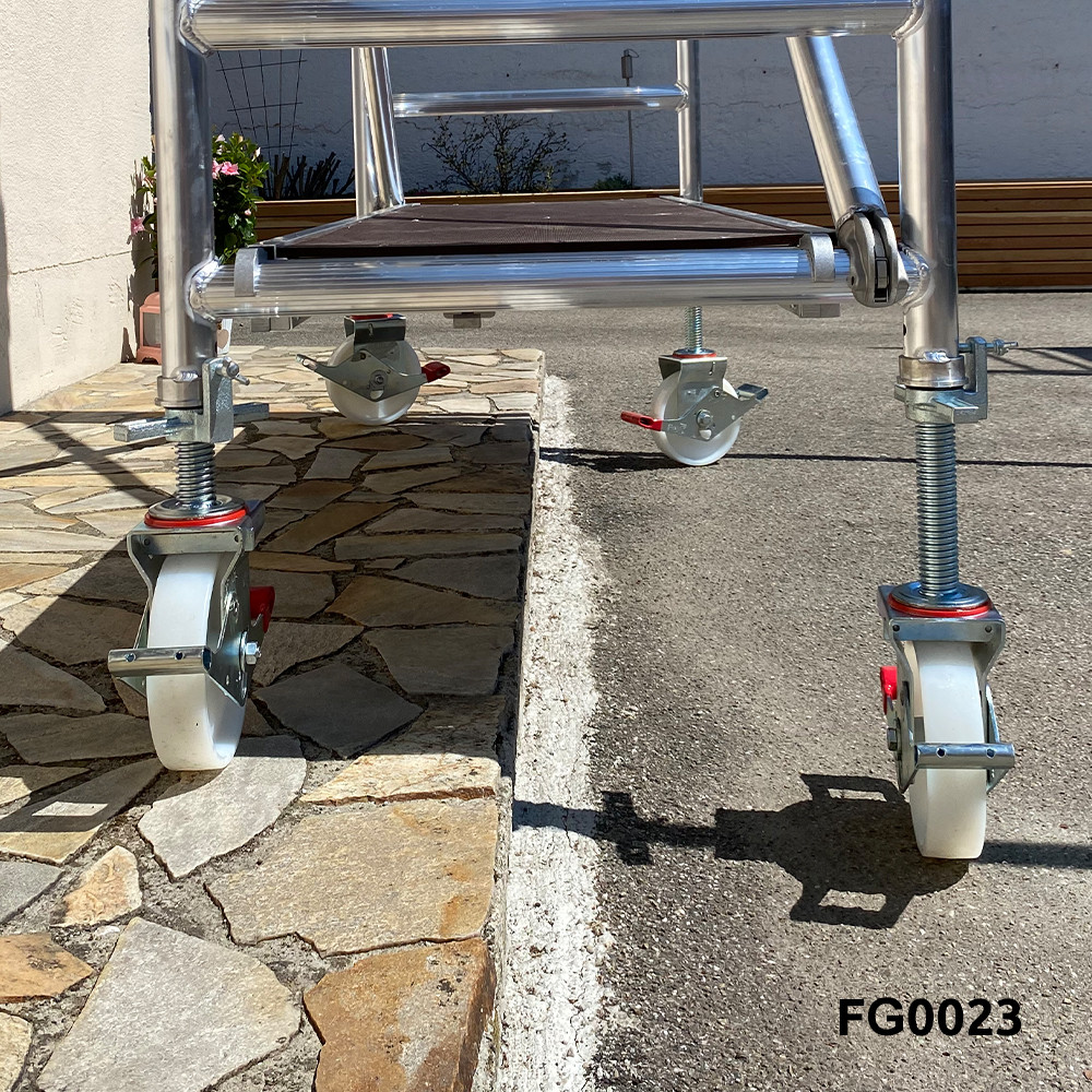 Der gesamte Mechanismus ist fast ohne Spiel. Nichts wackelt. Auch die Plattformen werden an den Sprossen eingehängt. Eine Aluminium-Sicherung verhindert unbeabsichtigtes Aushängen. Die Gerüststützen werden mit Halbkupplungen und Flügelmuttern am Gerüstrahmen befestigt. Es wird kein Werkzeug benötigt!