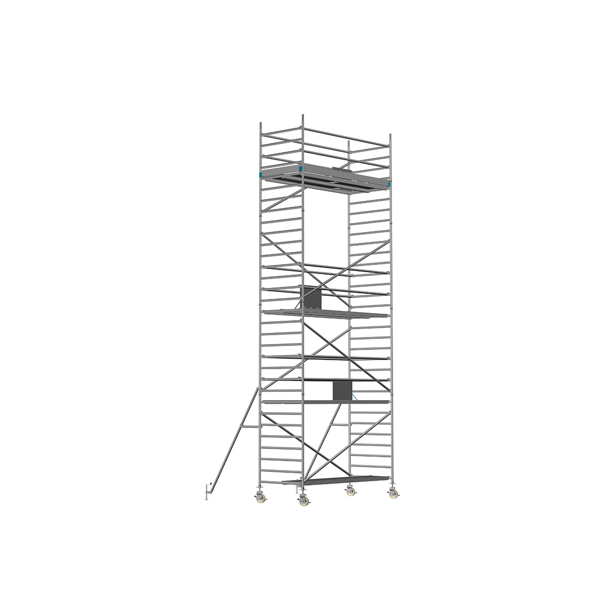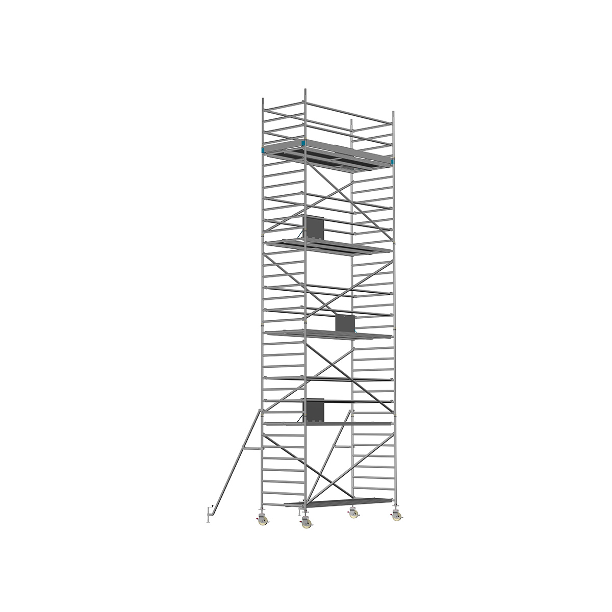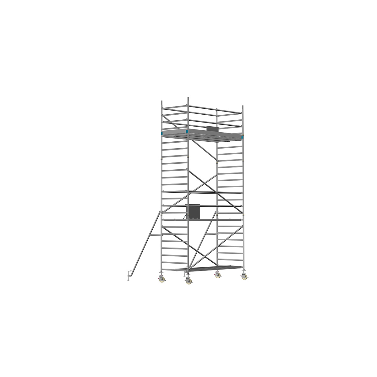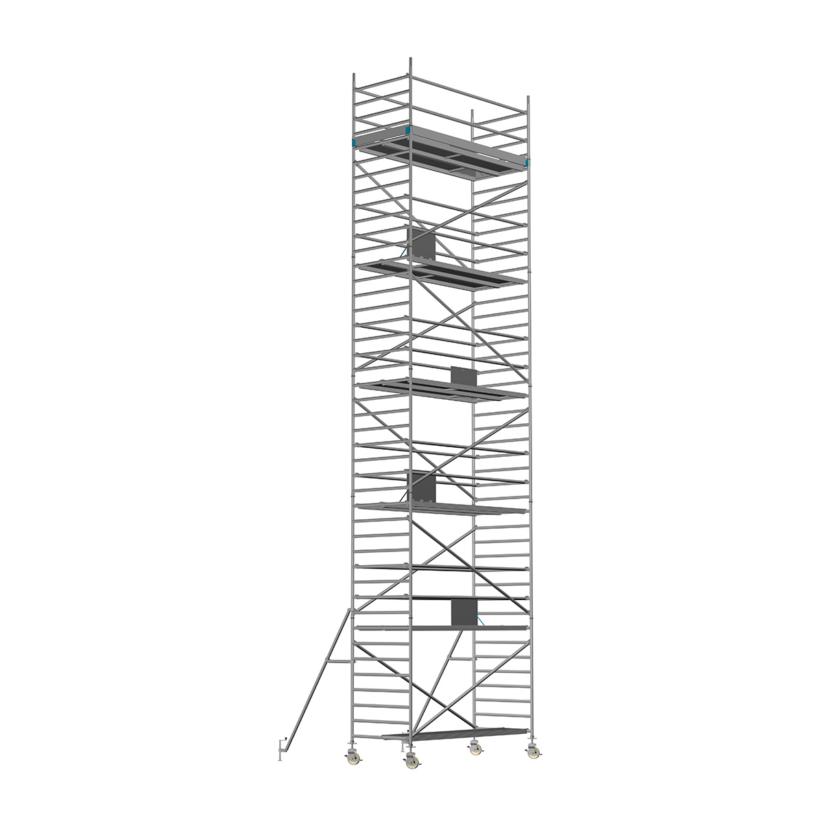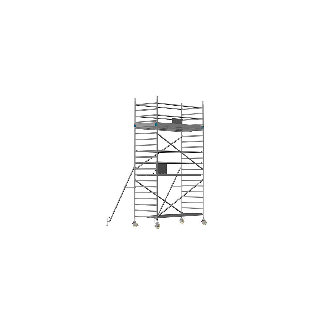 Unsere Fahrgerüste mit Rundsprossen entsprechen einer extra stabilen Industrieausführung. Der Aufbau ist kinderleicht, da es sich um einfache Steckverbindungen handelt. An den Diagonalen und Horizontalen (Geländer) sind Aluminiumklauen angeschweißt, welche formschlüssig über der Rundsprosse liegen. Eine spezielle Sicherung verhindert versehentliches Aushängen.