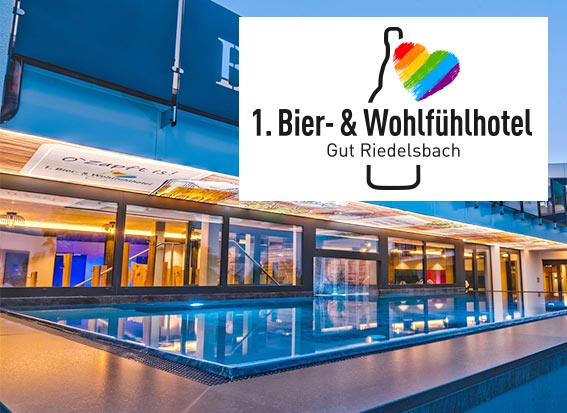 für das Bier- & Wohlfühlhotel Gut Riedelsbach im Bayerischen Wald. 3.000 m² Wellnessbereich mit 7 Saunen & Infrarotkabine, 5 Pools mit angenehmen 34 °C für Groß & Klein. Rund 100 Biersorten aus aller Welt und eigene Gasthausbrauerei. Regionale, ehrliche Küche.
