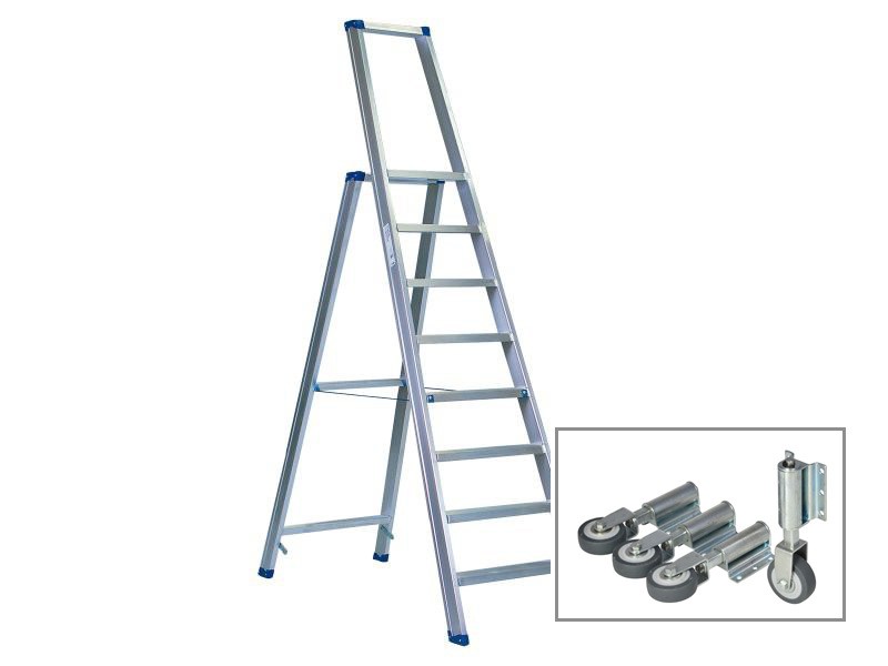 | Art-Nr. | Stufen incl. Plattform | Holmmaß mm | Gewicht kg | Breite unten m | Stand-Höhe m | Höhe aufgestellt m | Transport-Länge m | Listen-Preis € | Online-Preis € | |