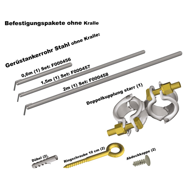 | F000457 | Befestigungspaket 2: 1,5m ohne Kralle | 7,00 | 103,00 | 57,00 | ||