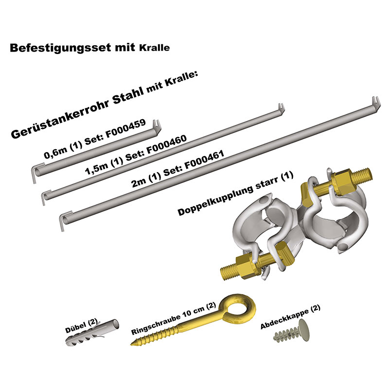 | F000459 | Befestigungspaket 4: 0,6m mit Kralle | 4,50 | 91,00 | 50,00 | ||